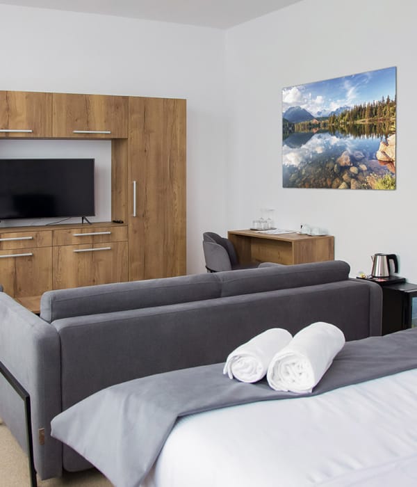 Modern furnished, generous and bright room with a comfortable double bed and a sofa bed for two people. Ideal for a couple or a family with a child.